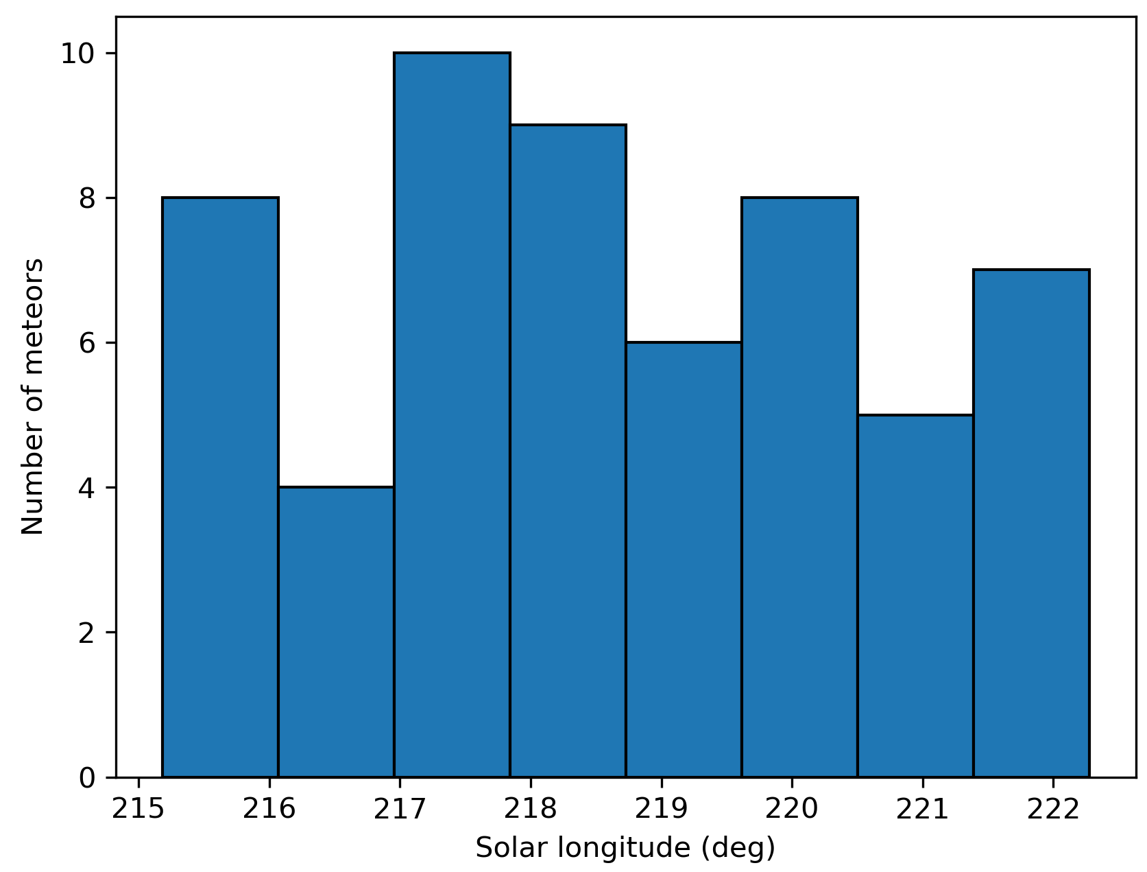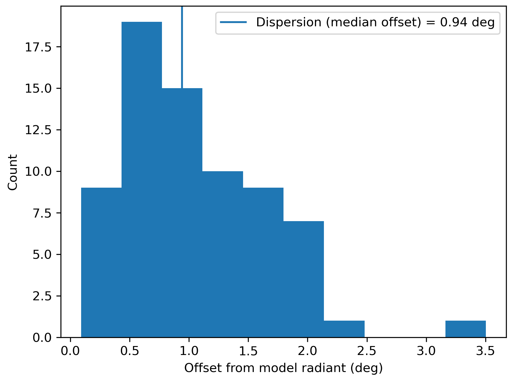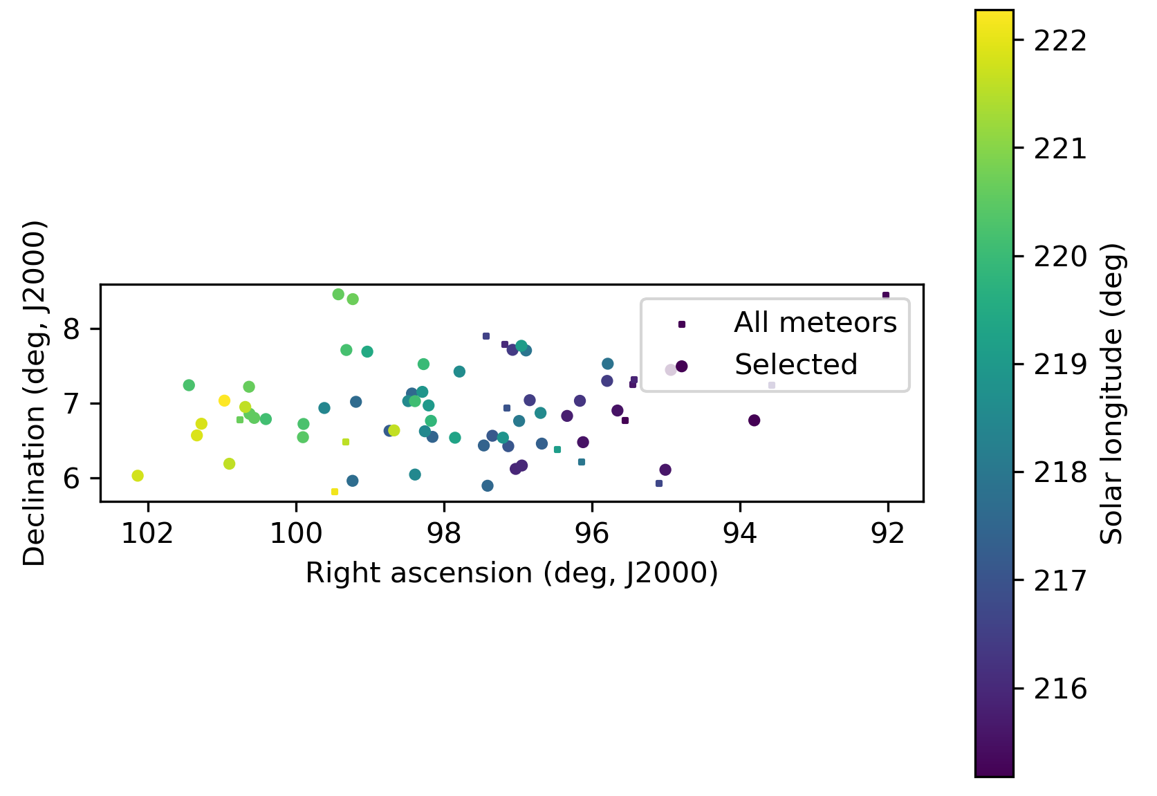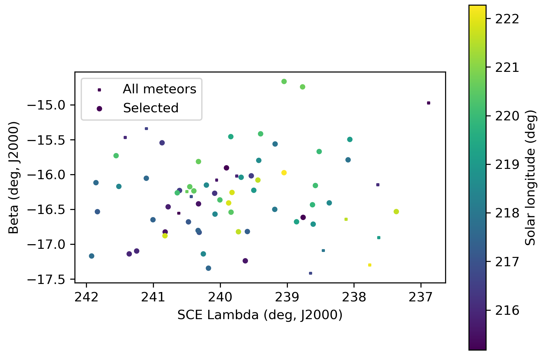 The GMN shower association criteria assume that meteors within 1° in solar longitude, within 2.2° in radiant in this case, and within 10% in geocentric velocity of a shower reference location are members of that shower. Further details about the shower association are explained in Moorhead et al. (2020).