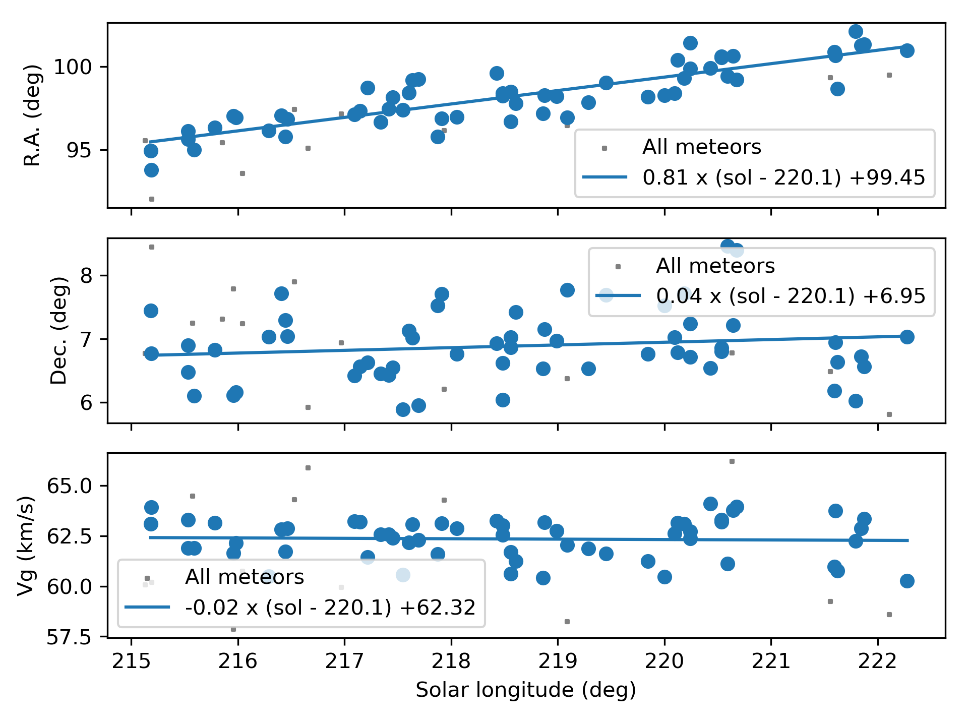 The shower had a median geocentric radiant with coordinates R.A. = 99.5°, Decl. = +7.0°, within a circle with a standard deviation of ±0.9° (equinox J2000.0). The radiant drift in R.A. is +0.81° on the sky per degree of solar longitude and +0.04° in Dec., both referenced to λʘ = 220.1° (Figures 3 and 4). The uncorrected raw numbers of shower meteors per degree in solar longitude show a fluctuating activity level (Figure 5) since poor weather clouded out many cameras during some days of the shower activity. Figures 6 and 7 show that the new activity source appeared on top of the sporadic background noise. The median Sun-centered ecliptic coordinates were λ – λʘ = 239.7°, β = –16.2° (Figure 8). The geocentric velocity was 62.3 ± 0.2 km/s. The shower parameters as obtained by the GMN method are listed in Table 1.