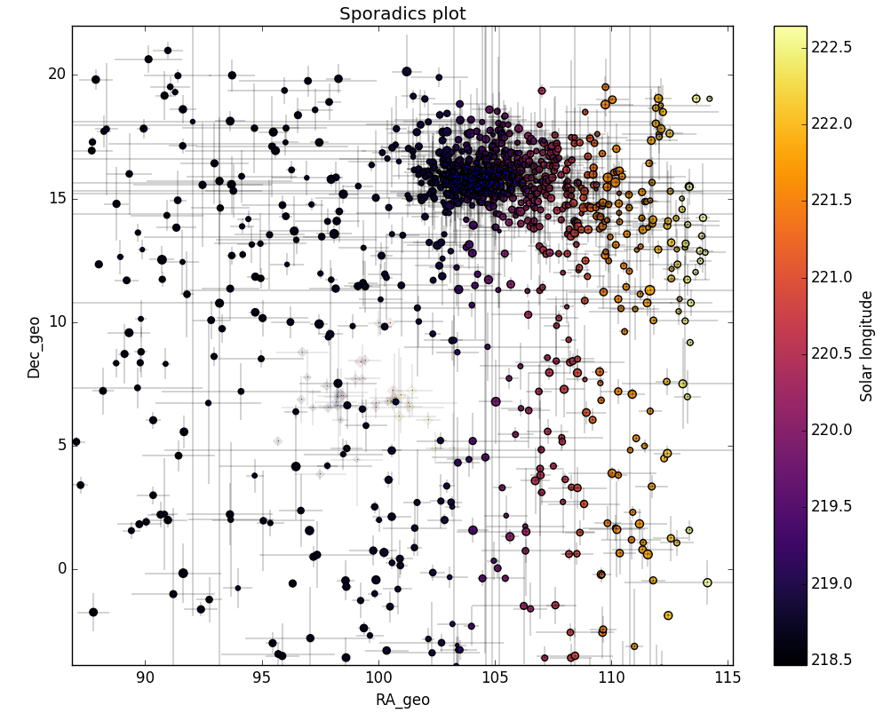 Figure 6 – All non-shower meteor radiants in geocentric equatorial coordinates during the shower activity. The pale diamonds represent the shower radiants plots, error bars represent two sigma values in both coordinates.