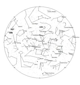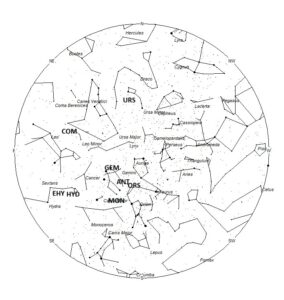 Now that the activity from particles produced by comet 2P/Encke have ceased encountering the Earth, the Taurid showers for 2025 are over and we resume reporting activity from the Anthelion (ANT) radiant. This is not a true radiant, but rather activity caused by the Earth’s motion through space. As the Earth revolves around the sun it encounters particles orbiting in a pro-grade motion that are approaching their perihelion point. They all appear to be radiating from an area near the opposition point of the sun, hence the name Anthelion. These were once recorded as separate showers throughout the year, but it is now suggested to bin them into a category separate from true showers and sporadics. This radiant is a very large oval some thirty degrees wide by fifteen degrees high. Activity from this radiant can appear from more than one constellation. The position listed here is for the center of the radiant which is currently located at 06:20 (095) +23. This position lies in western Gemini, near the spot occupied by the 4th magnitude star known as mu Geminorum. This radiant is best placed near 01:00 local standard time (LST) when it lies on the meridian and is highest in the southern sky. Rates at this time should be near 3 per hour as seen from the northern hemisphere and 2 per hour as seen from south of the equator. With an entry velocity of 30 km/sec., the average Anthelion meteor would be of medium-slow velocity.
