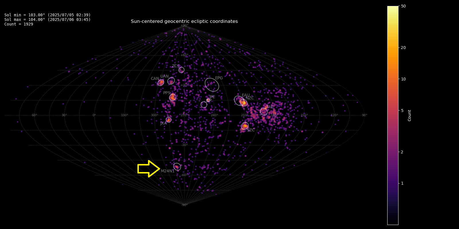 Figure 1 – Radiant density map (sinusoidal projection) with 1929 radiants obtained by the Global Meteor Network during 5–6 July, 2025. The position of the M2024-N1 radiant in Sun-centered geocentric ecliptic coordinates is marked with a yellow arrow.
