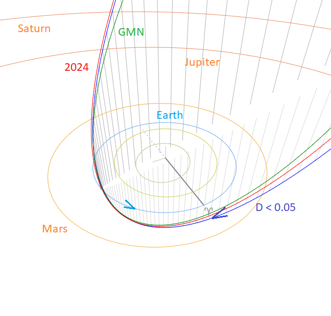 Zooming in at the orbits in the inner Solar System we see that the three solutions look almost identical, longitude of perihelion, perihelion distance, node and inclination all agree very well (Figure 11). The M2024-N1 meteoroid stream encounters the Earth at its ascending node on a steep retrograde orbit, almost perpendicular to the ecliptic plane.