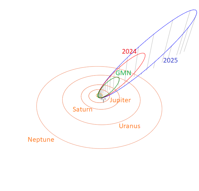 Table 1 – Comparing solutions for 2025 and 2024 derived by two different methods, GMN-method based on radiant positions and orbit association for DD < 0.05 in 2025, DD < 0.06 in 2024.