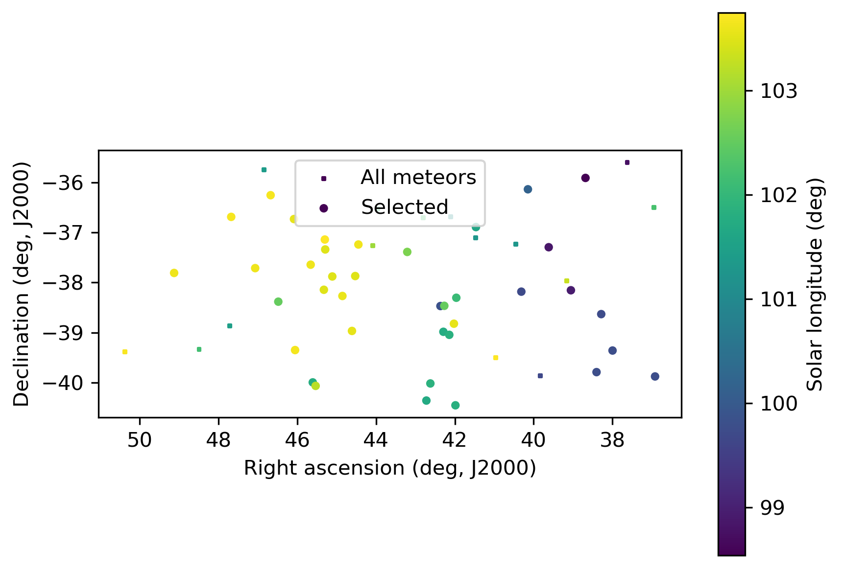 Figure 3 – The radiant distribution during the solar-longitude interval 99.0° – 104° in equatorial coordinates in 2025.