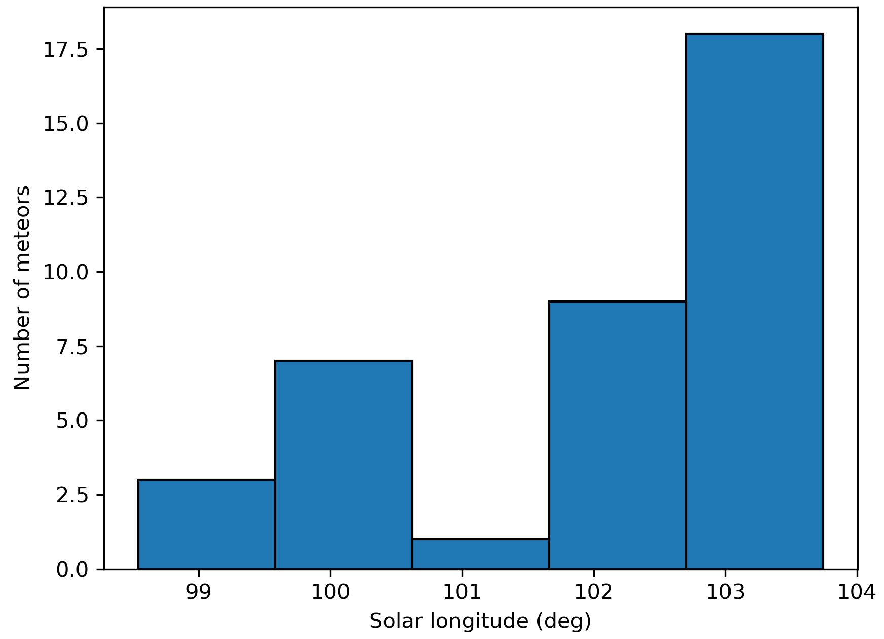 Figure 5 – The uncorrected number of M2024-N1 meteors per degree in solar longitude recorded in 2025.