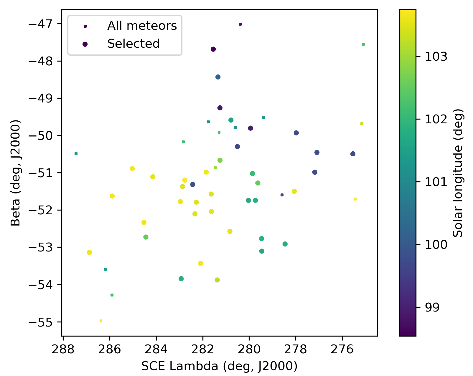 Figure 6 – The radiant distribution during the solar-longitude interval 99° – 104° in Sun centered geocentric ecliptic coordinates.