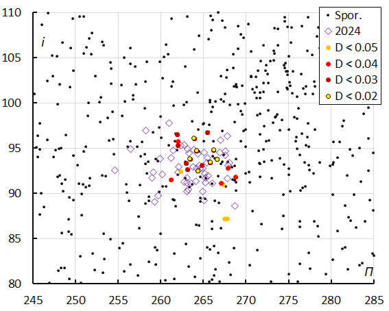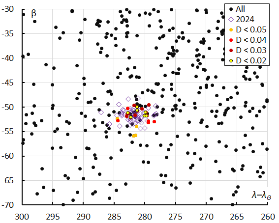 Comparing the diagrams of inclination and eccentricity versus longitude of perihelion in 2024 and in 2025 (Figures 8 and 9), it is evident that a large dispersion in eccentricity appeared for 2024 when a threshold cutoff of DD < 0.06 was used. This value appears to have been too tolerant.