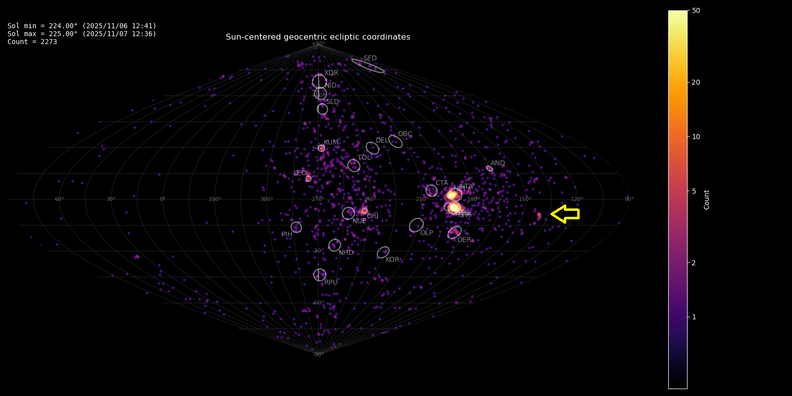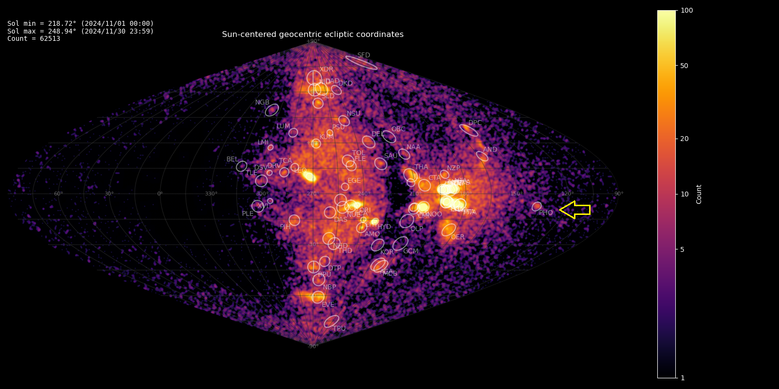 Figure 25 – Radiant density map (sinusoidal projection) with 62513 radiants obtained by the Global Meteor Network during November, 2024. The position of the 29-Piscids in Sun-centered geocentric ecliptic coordinates is marked with a yellow arrow.