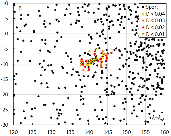 Figure 12 – The radiant distribution during the solar-longitude interval 217° – 228° in Sun-centered geocentric ecliptic coordinates, color-coded for different threshold values of the DD orbit similarity criterion.