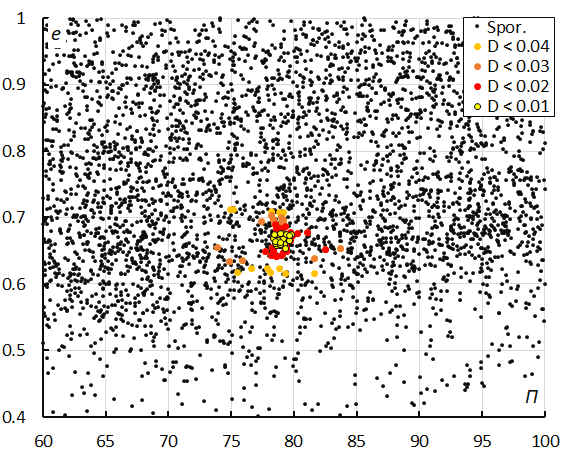 Figure 15 – The diagram of the eccentricity e versus the longitude of perihelion Π color-coded for different classes of D criteria thresholds, for λʘ between 217° and 228°.