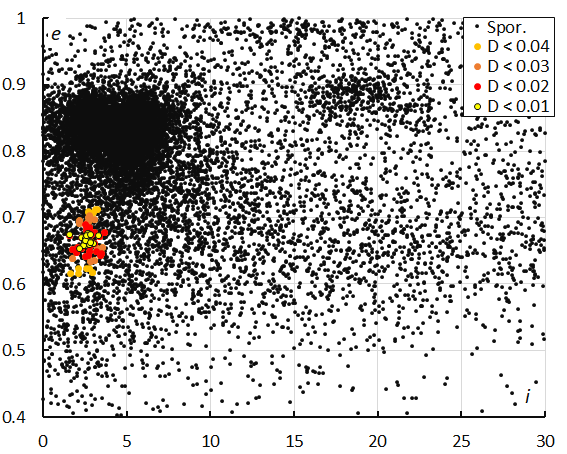 Figure 16 – The diagram of the eccentricity e versus the inclination i color-coded for different classes of D criteria thresholds, for λʘ between 217° and 228°.