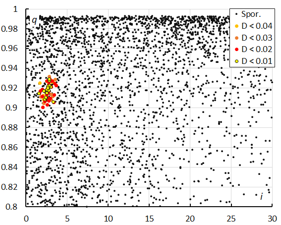 Figure 17 – The diagram of the perihelion distance q versus the inclination i color-coded for different classes of D criteria threshold, for λʘ between 217° and 228°.