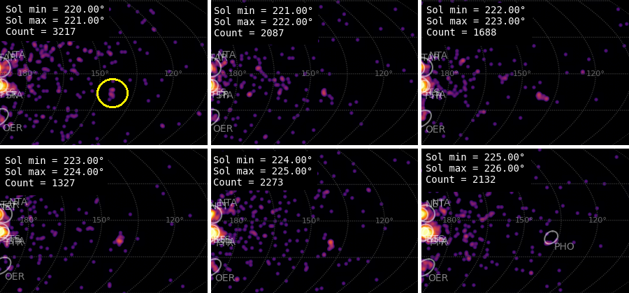 Figure 2 – The appearance of the 29-Piscids radiant between November 2–8, 2025 (220.0° < λʘ < 226.0°).