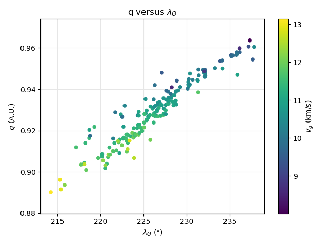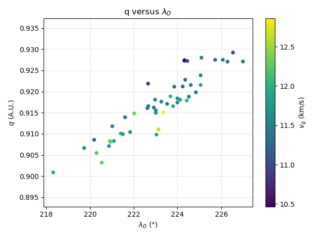 Figure 24 – The diagram of the perihelion distance q against the solar longitude λʘ, color-coded in function of the geocentric velocity vg for the 2019, 2024 and 2025 data combined.