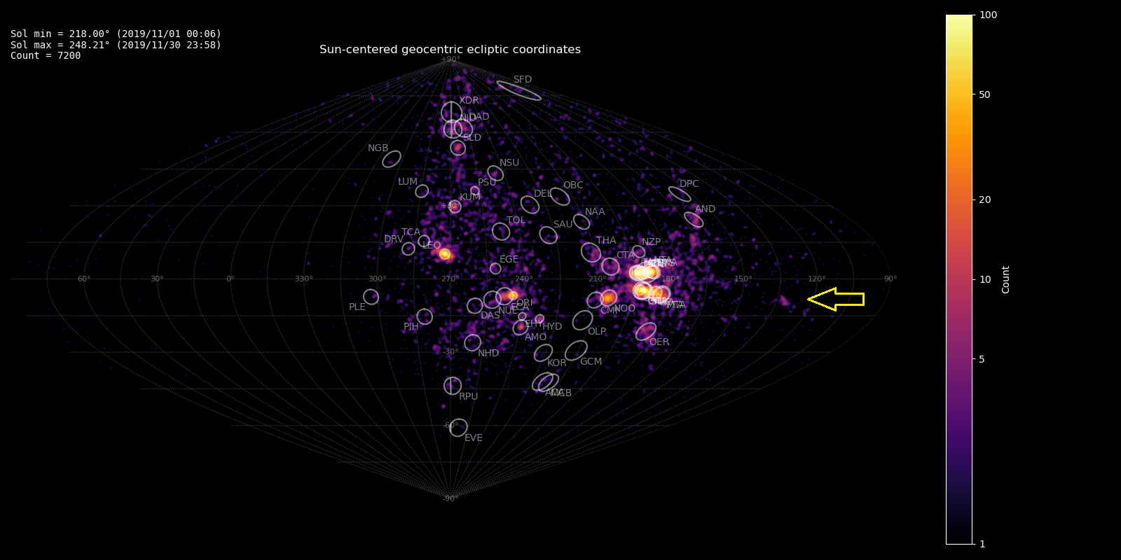 Figure 26 – Radiant density map (sinusoidal projection) with 7200 radiants obtained by the Global Meteor Network during November, 2019. The position of the 29-Piscids in Sun-centered geocentric ecliptic coordinates is marked with a yellow arrow.