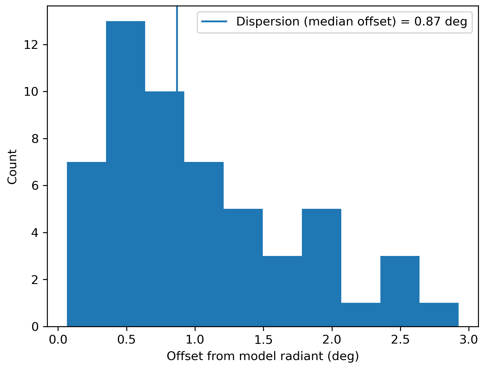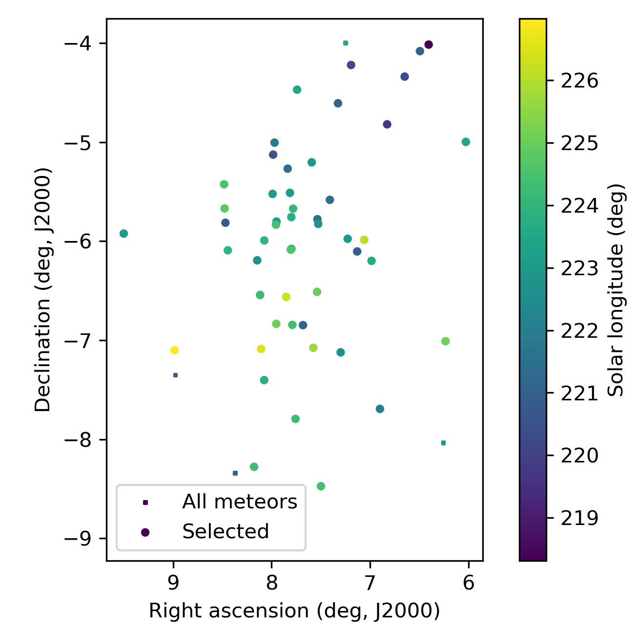The GMN shower association criteria assume that meteors within 1° in solar longitude, within 1.8° in radiant in this case, and within 10% in geocentric velocity of a shower reference location are members of that shower. Further details about the shower association are explained in Moorhead et al. (2020). Using these meteor shower selection criteria, 50 orbits have been identified as 29-Piscids.