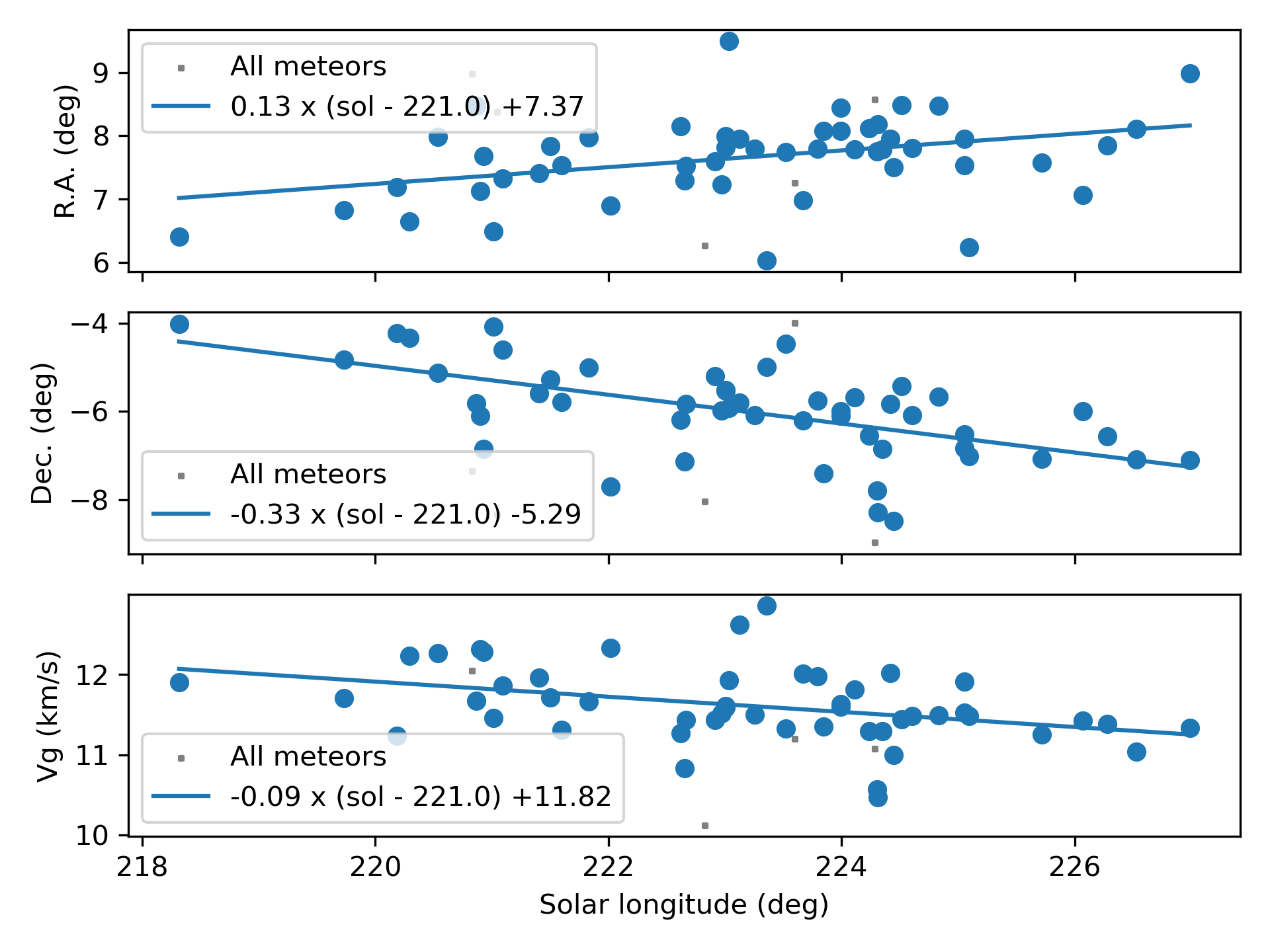 The shower was independently observed in 2025 by 127 cameras in Australia, Bosnia and Herzegovina, Belgium, Brazil, Croatia, Czechia, Germany, Netherlands, New Zealand and South Africa, South Korea, Ukraine, United Kingdom and United States. The shower had a median geocentric radiant with coordinates R.A. = 7.37°, Decl. = –5.29°, within a circle with a standard deviation of ±0.9° (equinox J2000.0) (Figure 3). The radiant drift in R.A. is +0.13° on the sky per degree of solar longitude and –0.33° in Dec., both referenced to λʘ = 221.0° (Figures 4 and 5). The median Sun-centered ecliptic coordinates were λ – λʘ = 143.66°, β = –7.79° (Figure 9) with a strong drift in Sun-centered ecliptic coordinates Δ(λ–λʘ)/Δλʘ = –1.01° and Δβ/Δλʘ = –0.35°. This means that one or more orbital elements changed during the transit of the Earth through the meteoroid stream. The geocentric velocity was 11.82 ± 0.09 km/s.