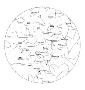 The last of the eta Hydrids (EHY) may appear this week. The radiant is currently located at 09:56 (149) -02. This area of the sky lies in western Sextans, 3 degrees southwest of the 4th magnitude star known as Ukdah (alpha Sextantis). This radiant is best placed near 0400 LST, when it lies highest above the southern horizon. Rates should be less than 1 no matter your location. With an entry velocity of 61 km/sec., most activity from this radiant would be of appear medium-fast.