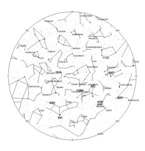 I have also included charts of the sky that display the radiant positions for evening, midnight, and morning. The center of each chart represents the sky directly overhead at the corresponding hour. These charts are oriented for facing south but can be used for any direction by rotating them accordingly. A planisphere or planetarium app is also useful for showing the sky at any time of night on any date of the year.
