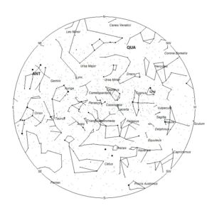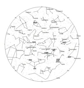 The alpha Hydrids (AHY) were discovered by Dr. Peter Brown and are mentioned in his article “A meteoroid stream survey using the Canadian Meteor Orbit Radar”. This shower is active from December 15 through January 22 with maximum activity occurring on January 4th. The radiant is currently located at 08:12 (123) -07. This position lies on the Monoceros/Hydra border, 3 degrees southeast of the 4th magnitude star known as zeta Monocerotis. These meteors are best seen near 0200 LST when the radiant lies highest above the southern horizon. At 45 km/sec. the alpha Hydrids produce meteors of medium velocity. Expected rates this week are less than 1 per hour no matter your location.