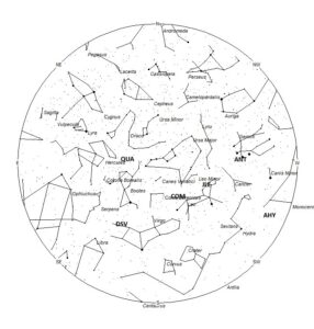 I have also included charts of the sky that display the radiant positions for evening, midnight, and morning. The center of each chart represents the sky directly overhead at the corresponding hour. These charts are oriented for facing south but can be used for any direction by rotating them accordingly. A planisphere or planetarium app is also useful for showing the sky at any time of night on any date of the year.