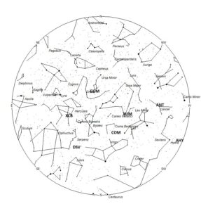The Comae Berenicids (COM) are a long duration shower active from December 5th through February 4th. Maximum activity occurred on December 19th. The radiant is currently located at 12:28 (187) +18, which places it in southern Coma Berenices, 1 degree northwest of the star known as 24 Comae Berenices. These meteors would be best seen near 05:00 LST, when the radiant lies highest in the southern sky. Current rates should less than 1 no matter your location. At 63km/sec., these meteors would produce mostly swift meteors.