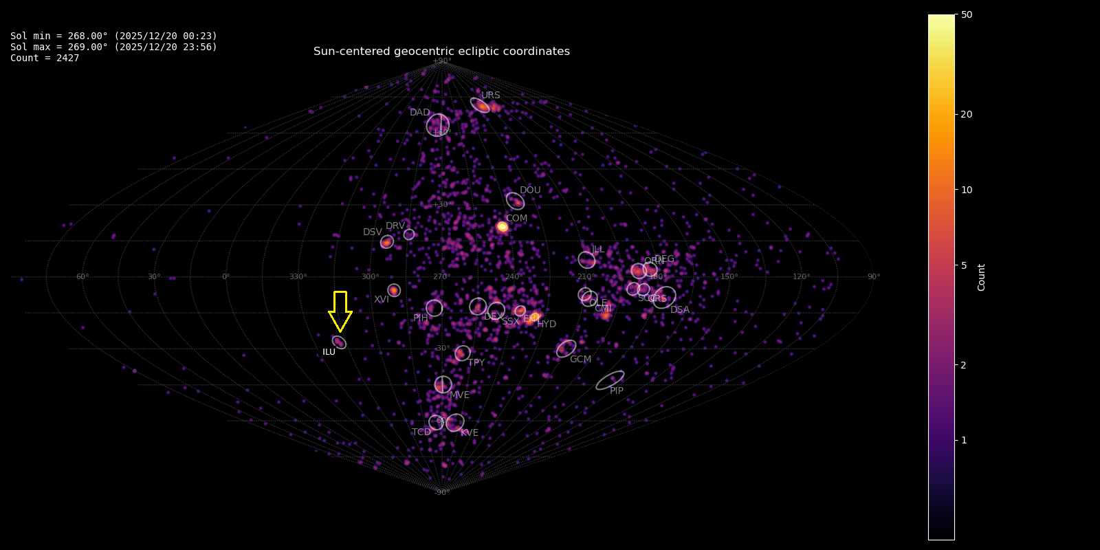 Figure 1 – Radiant density map with 2427 radiants obtained by the Global Meteor Network during 20–21 December, 2025. The position of the iota-Lupids in Sun-centered geocentric ecliptic coordinates is marked with a yellow arrow.