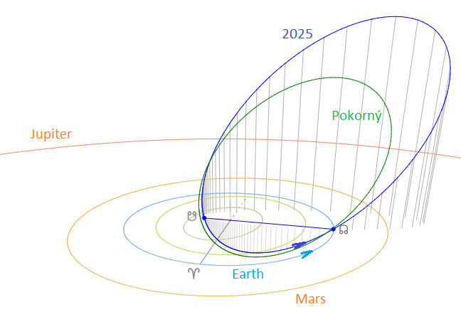 The iota-Lupids encounter the Earth at their ascending node (Figure 11). The position of the descending node is far inside the orbit of planet Mercury, which means that the meteoroids are exposed to extreme thermal stress due to intense Solar radiation. The orbit determined by radar observations is plotted in green and represents mainly smaller particles far inside the orbit (blue) determined by the low-light cameras of the Global Meteor Network.