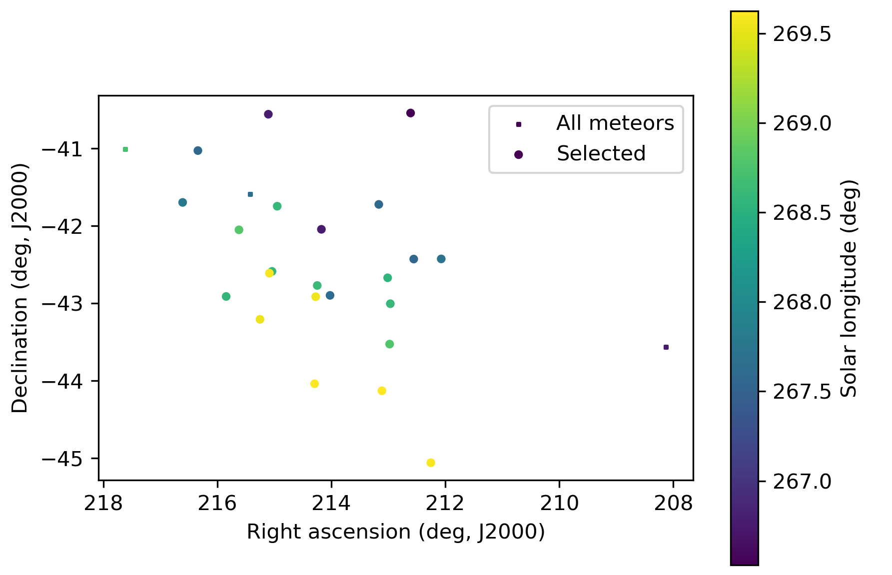 Figure 4 – The radiant distribution during the solar-longitude interval 266.5° – 269.5° in equatorial coordinates.