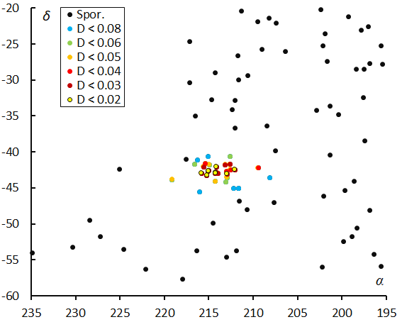 Figure 7 – The radiant distribution during the solar-longitude interval 265° – 273° in equatorial coordinates, color-coded for different threshold values of the DD orbit similarity criterion.