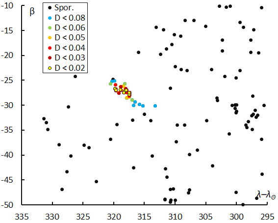 Figure 8 – The radiant distribution during the solar-longitude interval 265° – 273° in Sun-centered geocentric ecliptic coordinates, color-coded for different threshold values of the DD orbit similarity criterion.