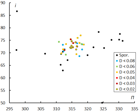 Figure 9 – The diagram of the inclination i against the longitude of perihelion Π color-coded for different classes of D criteria thresholds, for λʘ between 265° and 273°.