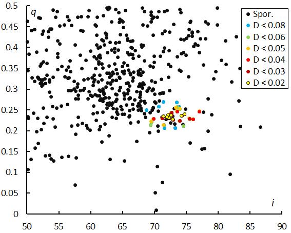 Figure 10 – The diagram of the perihelion distance q against the inclination i color-coded for different classes of D criteria thresholds, for λʘ between 265° and 273°.
