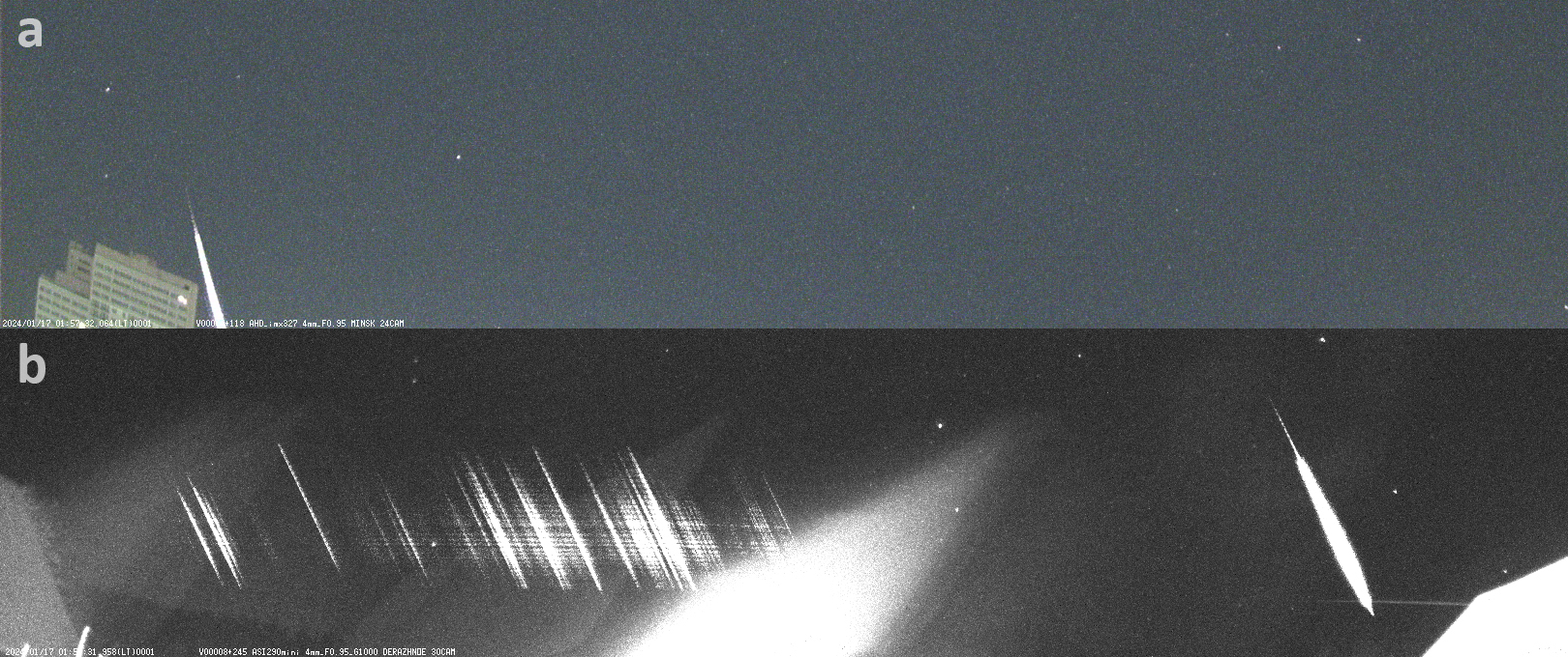 Figure 1 – Images of the meteor captured by the Minsk_24 camera (a) and the Derazhnoye_30 spectral camera (b), which shows the original image with a first-order diffraction spectrum. The spectral image also shows diffraction grating-induced stray light from a bright terrestrial object (illuminated rooftop).
