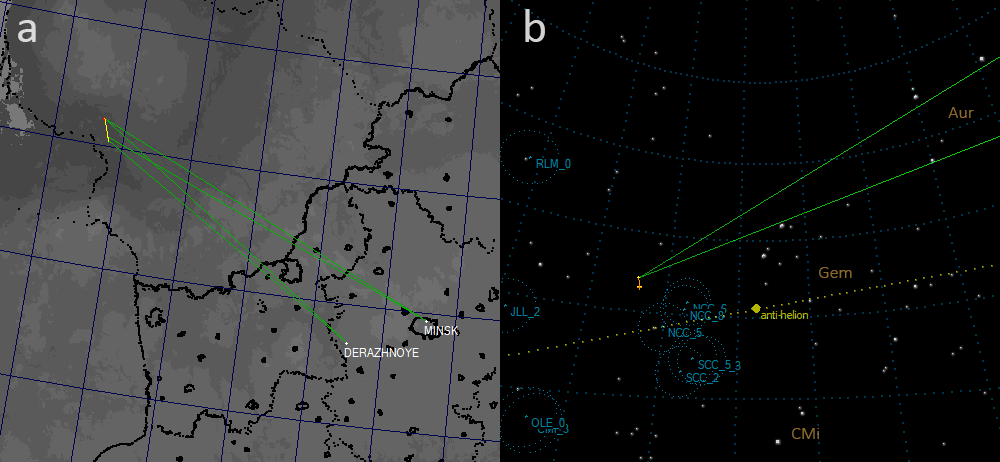 Figure 3 – Stations and meteor trajectory in projection on the Earth’s surface (a) and at the celestial sphere (b)