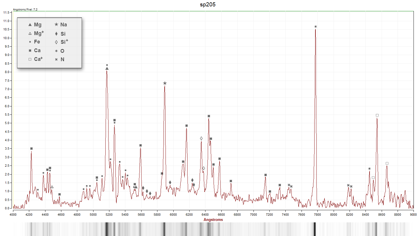 Additionally, the spectrum exhibits unusually intense lines of ionized silicon (Si II) at 6347 Å and 6371 Å. These lines are typically pronounced only in high-velocity meteors (V > 50 km/s), making their distinct presence in sp205 (V ~ 30 km/s) highly anomalous.
