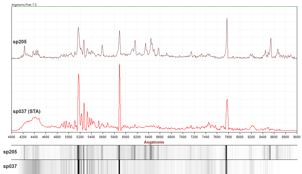 Figure 6 – Comparison of spectra of sp205 and sp037 (STA) in the range 4000–9000 Å. Displayed spectral profiles were corrected for the spectral sensitivity of the camera.
