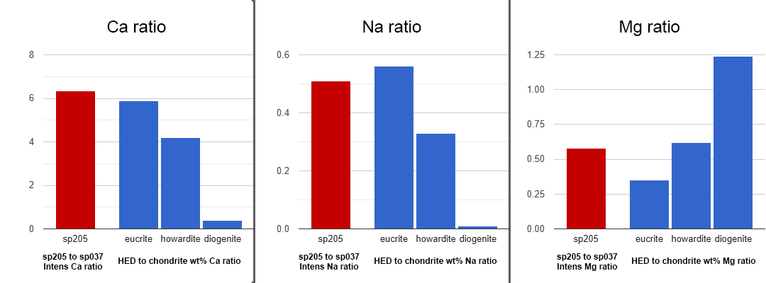 The ratios of the measured line intensities (sp205 / sp037) for calcium, sodium, and magnesium are plotted in Figure 7 alongside the corresponding ratios of their bulk abundances (HED / chondrite) from laboratory data. Iron was excluded from this comparison, as its abundance is similar across HED materials (Table 3). While calcium is the primary element of interest, sodium and magnesium were included to validate the methodological assumptions; agreement between spectral and bulk ratios for these elements would support the reliability of the approach for calcium.