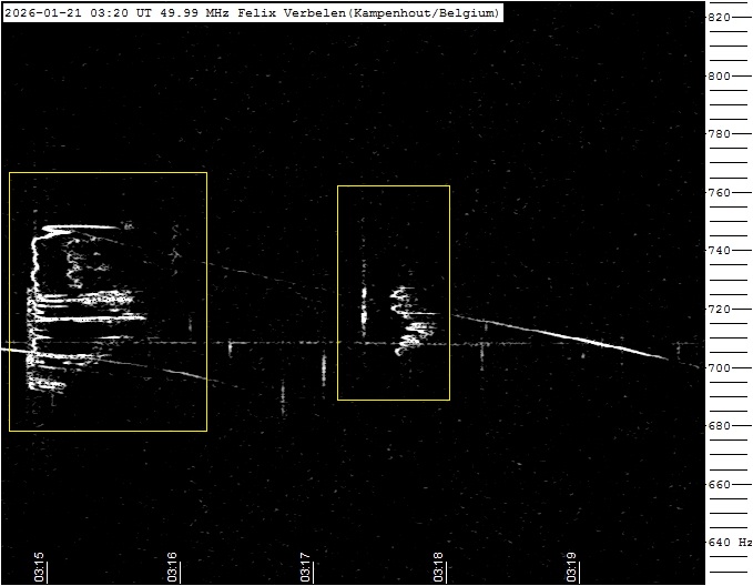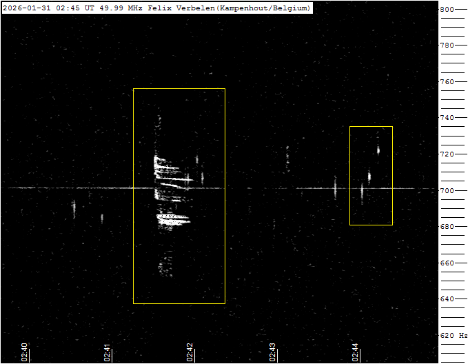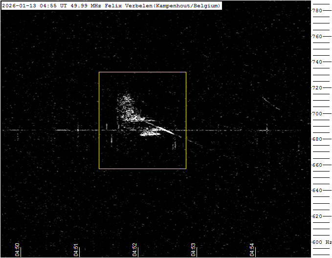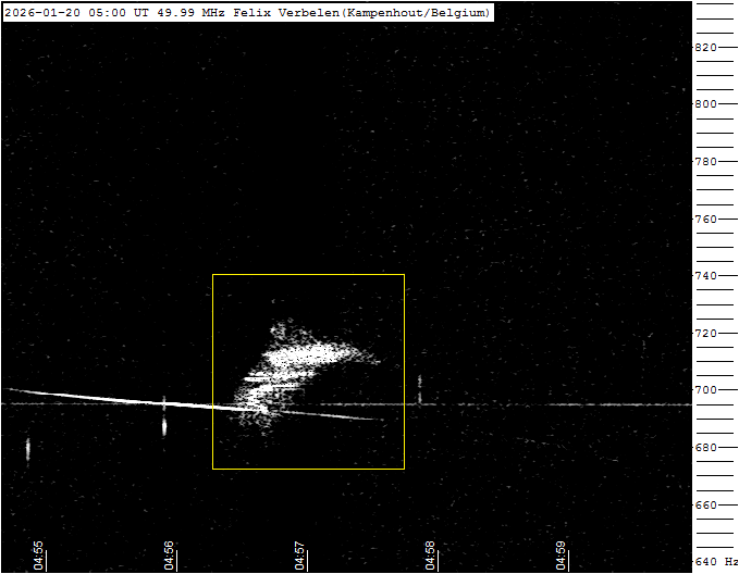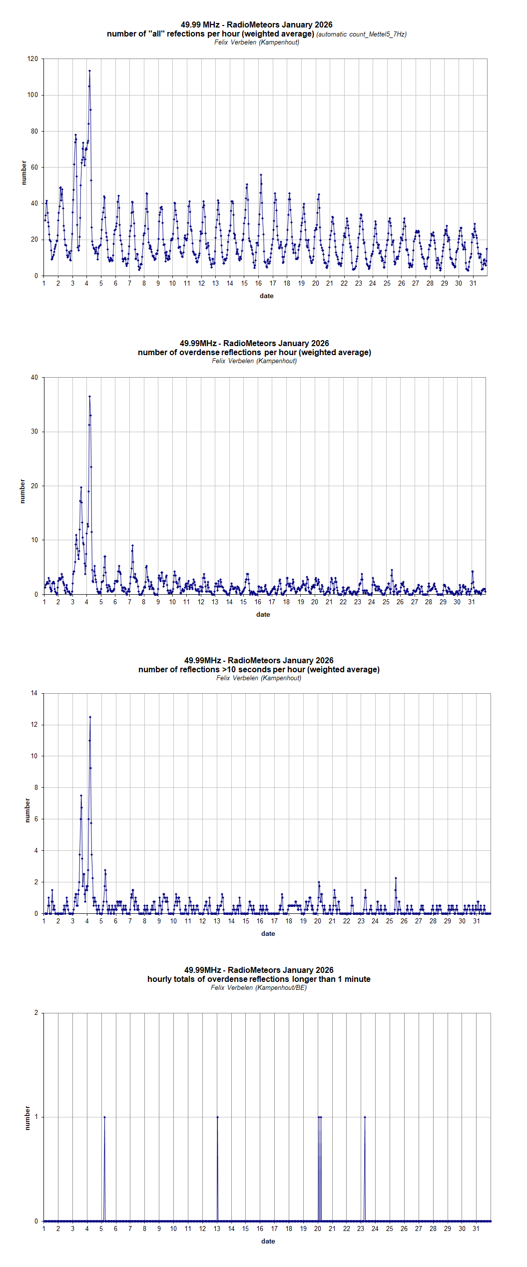 The graphs show both the daily totals (Figure 1) and the hourly numbers (Figure 2) of “all” reflections counted automatically, and of manually counted “overdense” reflections, overdense reflections longer than 10 seconds and longer than 1 minute, as observed here at Kampenhout (BE) on the frequency of our VVS-beacon (49.99 MHz) during the month of January 2026.