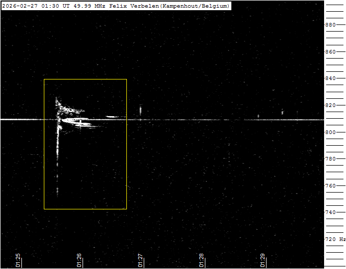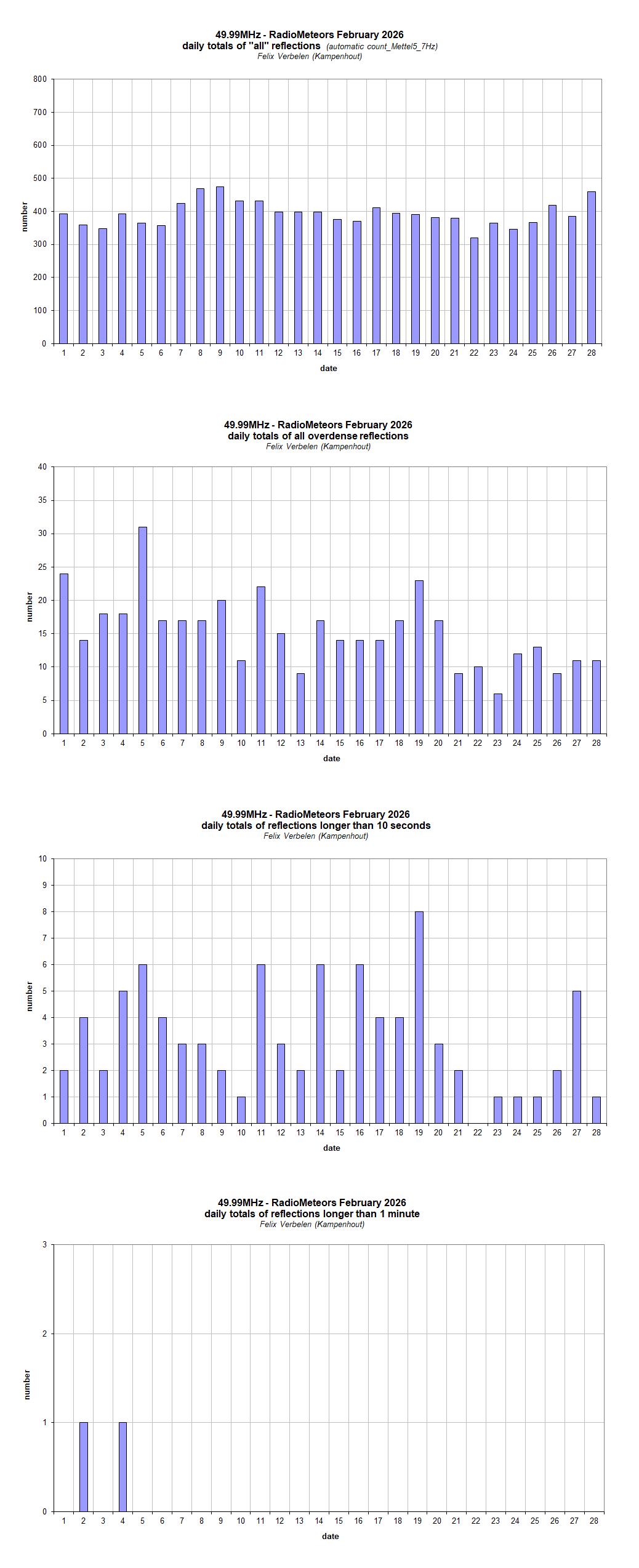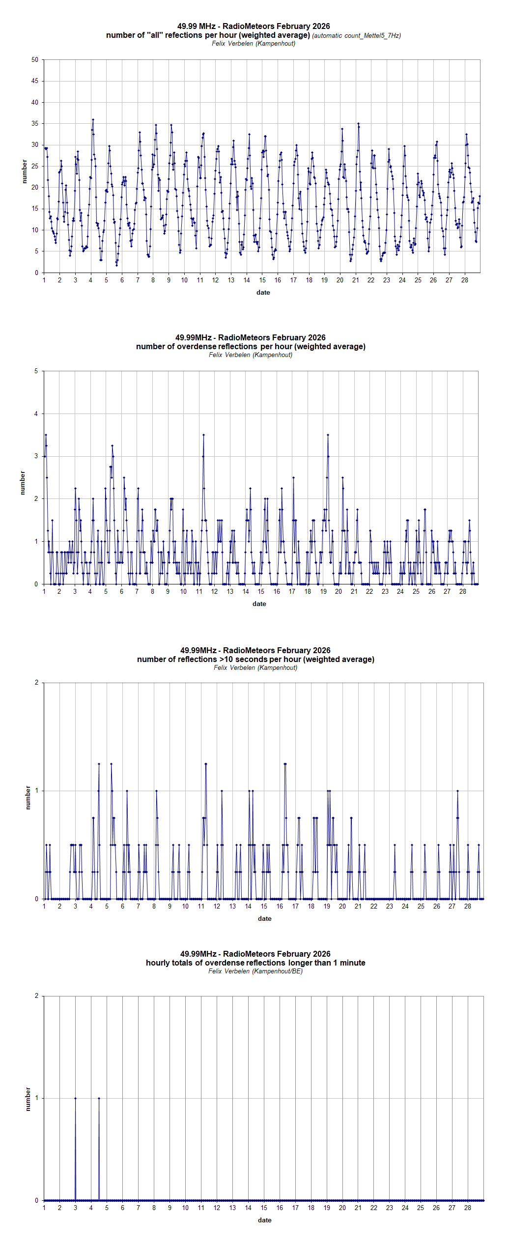The graphs show both the daily totals (Figure 1) and the hourly numbers (Figure 2) of “all” reflections counted automatically, and of manually counted “overdense” reflections, overdense reflections longer than 10 seconds and longer than 1 minute, as observed here at Kampenhout (BE) on the frequency of our VVS-beacon (49.99 MHz) during the month of February 2026.