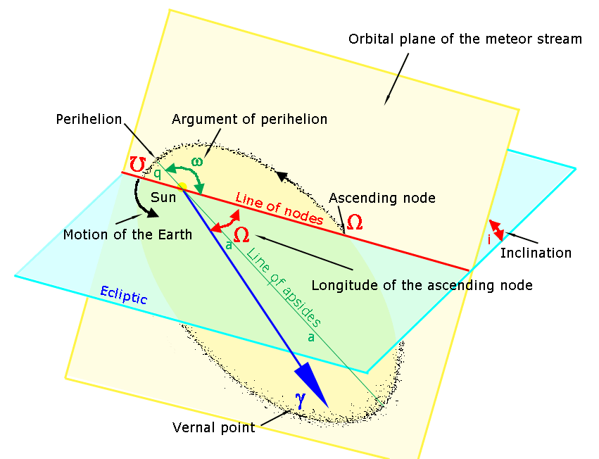 For meteoroid orbits we use five parameters that describe the shape, size and orientation of the meteoroid orbit. These parameters are known as the Keplerian elements, with the semi-major axis a, eccentricity e, inclination i, longitude of the ascending node Ω and argument of periapsis (perihelion) ω. The orbital elements are basic geometry using references like the ecliptic plane and the vernal equinox (see Figure 2).