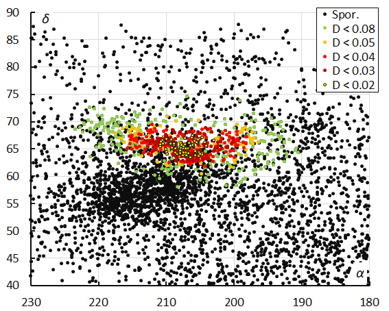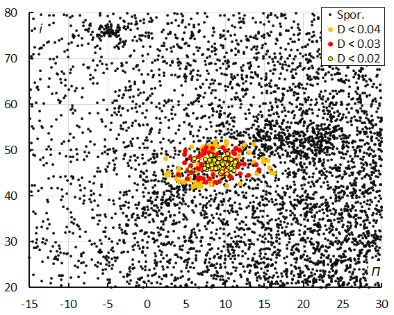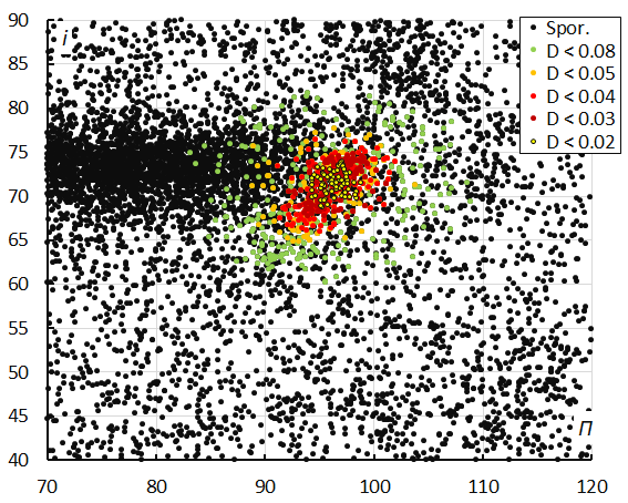Frequently used plots are those of one orbital element versus another orbital element, such as inclination i versus longitude of perihelion Π. An example of the October epsilon-Carinids is given in Figure 5. These diagrams visualize the concentration in orbital elements with the non-shower meteors in the background and the investigated shower meteors color-code for different D-criteria threshold classes.