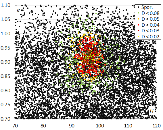 Figure 16 – The diagram of the eccentricity e versus the longitude of perihelion Π color-coded for different classes of D-criteria thresholds, for λʘ between 256° and 263°.