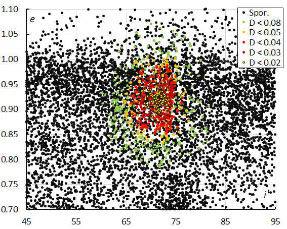 Moreover, the D-criteria have specific shortcomings. The Southworth and Hawkins criterion has been criticized for being too dependent on the perihelion distance q. The Drummond criterion is too sensitive for the eccentricity e. The criterion defined by Jopek reduces the above-mentioned dependencies.
