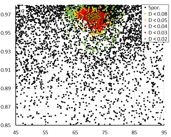 Figure 18 – The diagram of the perihelion distance q versus the inclination i color-coded for different classes of D-criteria thresholds, for λʘ between 256° and 263°.