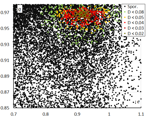 Figure 19 – The diagram of the perihelion distance q versus the eccentricity e color-coded for different classes of D-criteria thresholds, for λʘ between 256° and 263°.