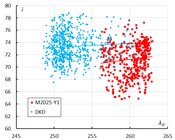 Depending on the type of orbits meteoroid streams appear as distinct clusters in these diagrams. Different clusters are visible in Figures 16 to 19, caused by different meteor showers such as e-Velids (EVE#746), alpha-Canis Majorids (ACA#394), gamma-Canis Majorids (GCM#395), etc. One particular activity source appears close to the M2025-Y1 or partly mixed in its cluster, the December kappa-Draconids (DKD#336). This suggests a physical connection between M2025-Y1 and the December kappa-Draconids. A sample of December kappa-Draconids has been taken from the 2024 GMN data for comparison.