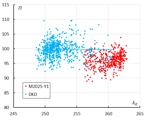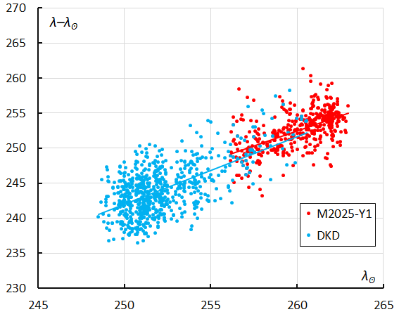 Figure 26 – The Sun-centered geocentric longitude λ–λʘ in function of the Solar Longitude λʘ for the M2025-Y1 orbits (2019–2025) and December kappa-Draconids (2024).