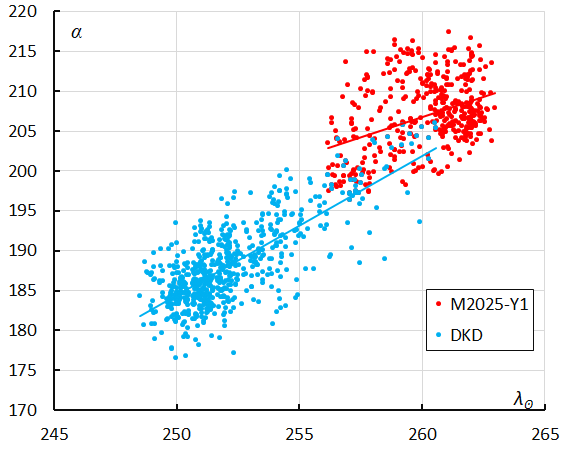 Figure 23 – The radiant drift in Right Ascension α in function of the Solar Longitude λʘ for the M2025-Y1 orbits (2019–2025) and December kappa-Draconids (2024).