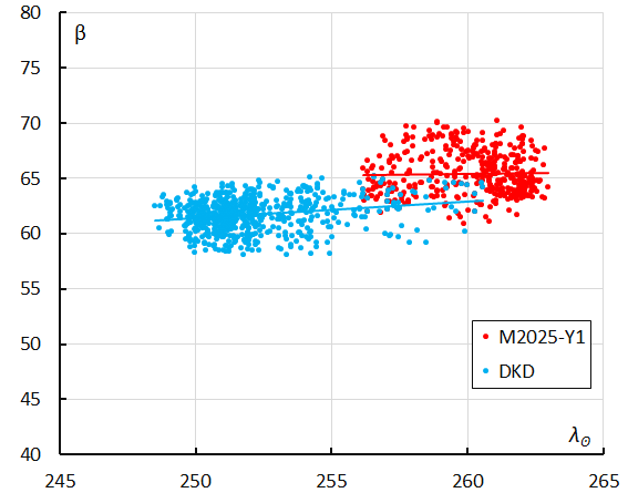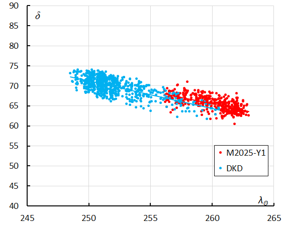 The radiant plot in Sun-centered geocentric ecliptic coordinates neutralizes the radiant drift caused by the movement of the Earth on its orbit around the Sun. The large scatter on radiants for DSH < 0.2 & DD < 0.08 & DJ < 0.2 indicates that these threshold values are too tolerant. Figure 13 shows a very dense cluster of M2025-Y1 radiants. At left is the concentration of the December alpha-Draconids and at right are December kappa-Draconids radiants. This shower had its maximum nine days before M2025-Y1, but the end of its activity period overlaps with the first days of the M2025-Y1 activity. Several M2025-Y1 orbits had been initially classified as December kappa-Draconids. The meteoroid stream parameters of this shower are added to Table 6 as these resemble a lot to those of M2025-Y1.